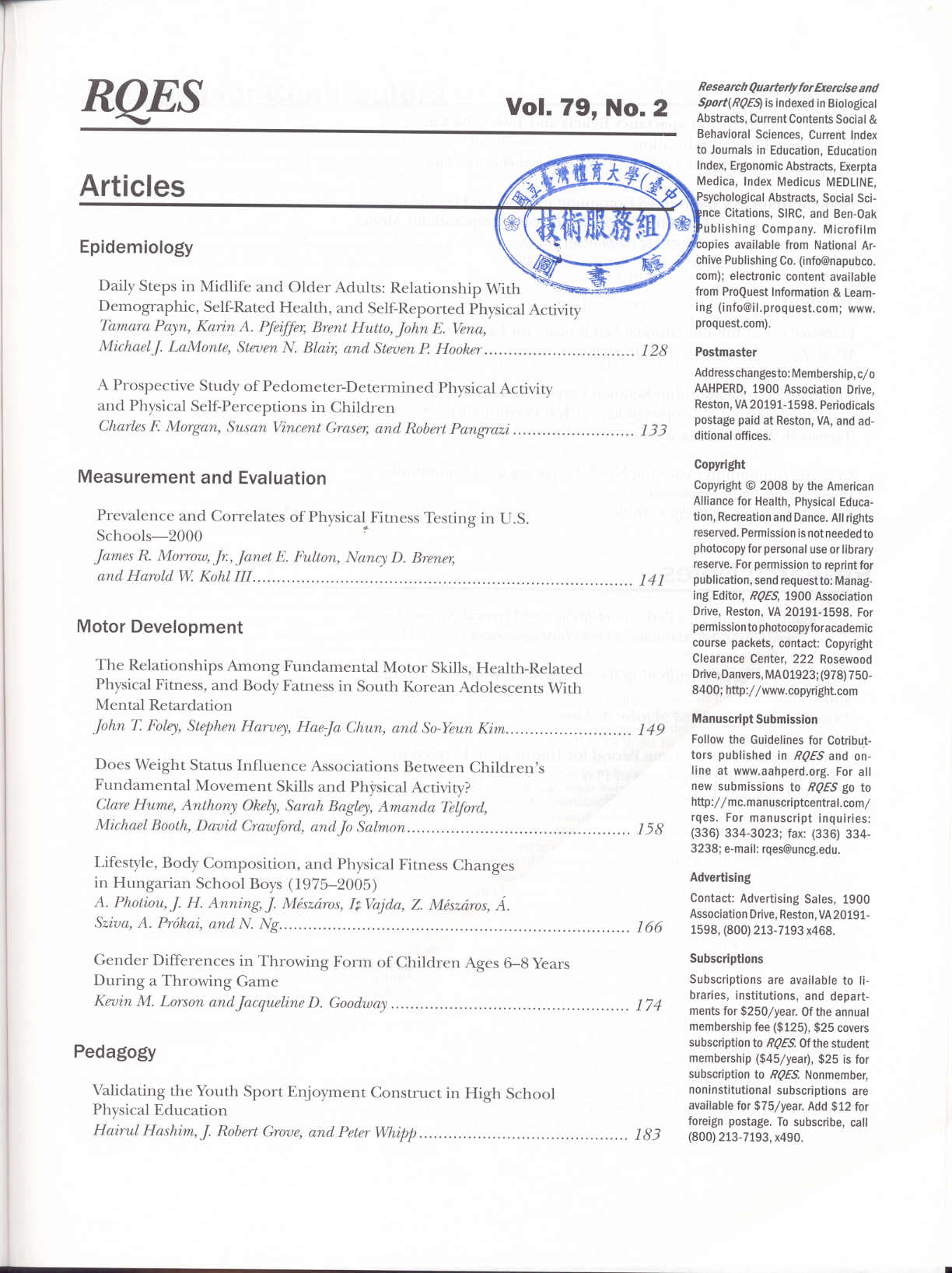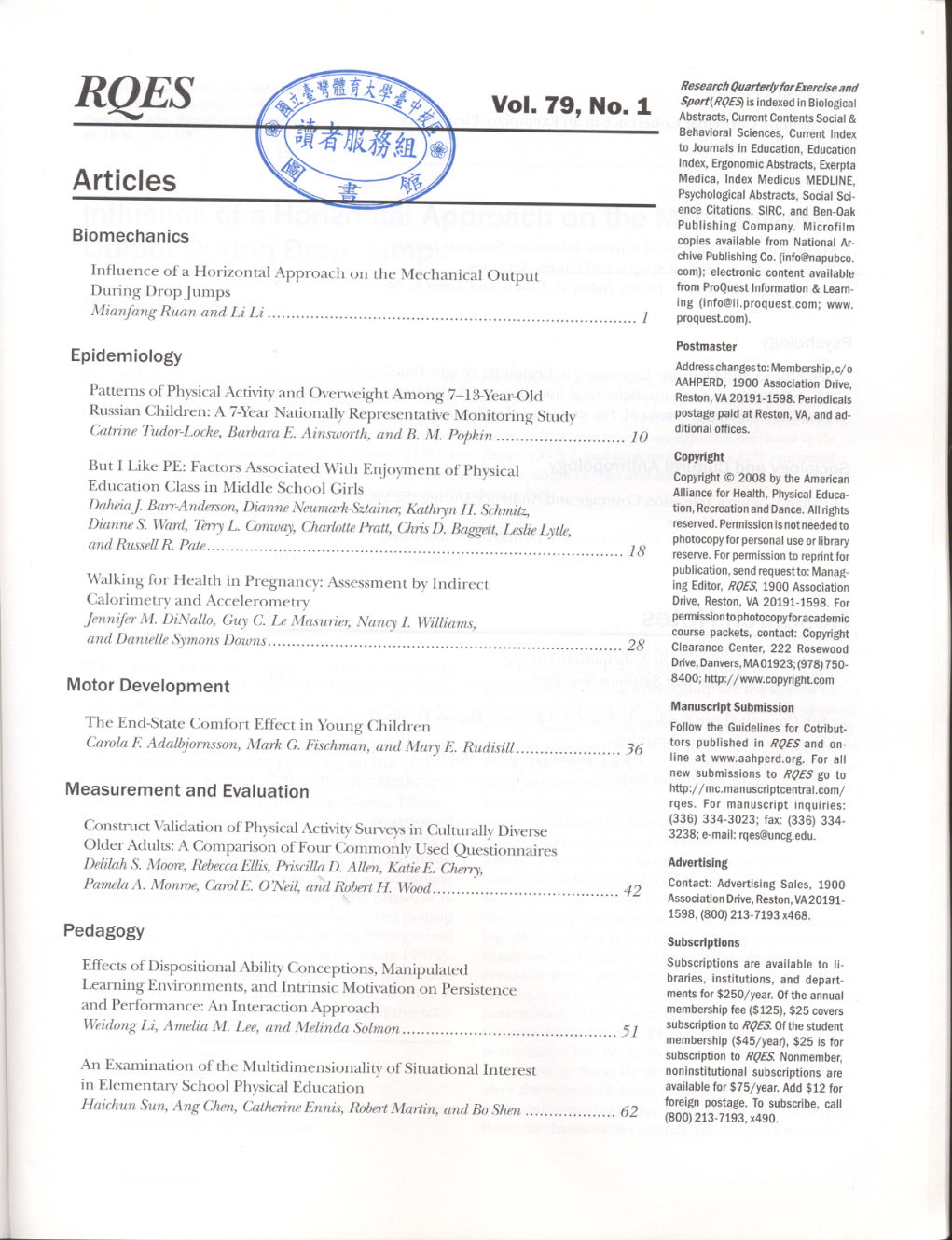 Research Quarterly for Exercise and Sport 2008-03v.79-1(目次服務)