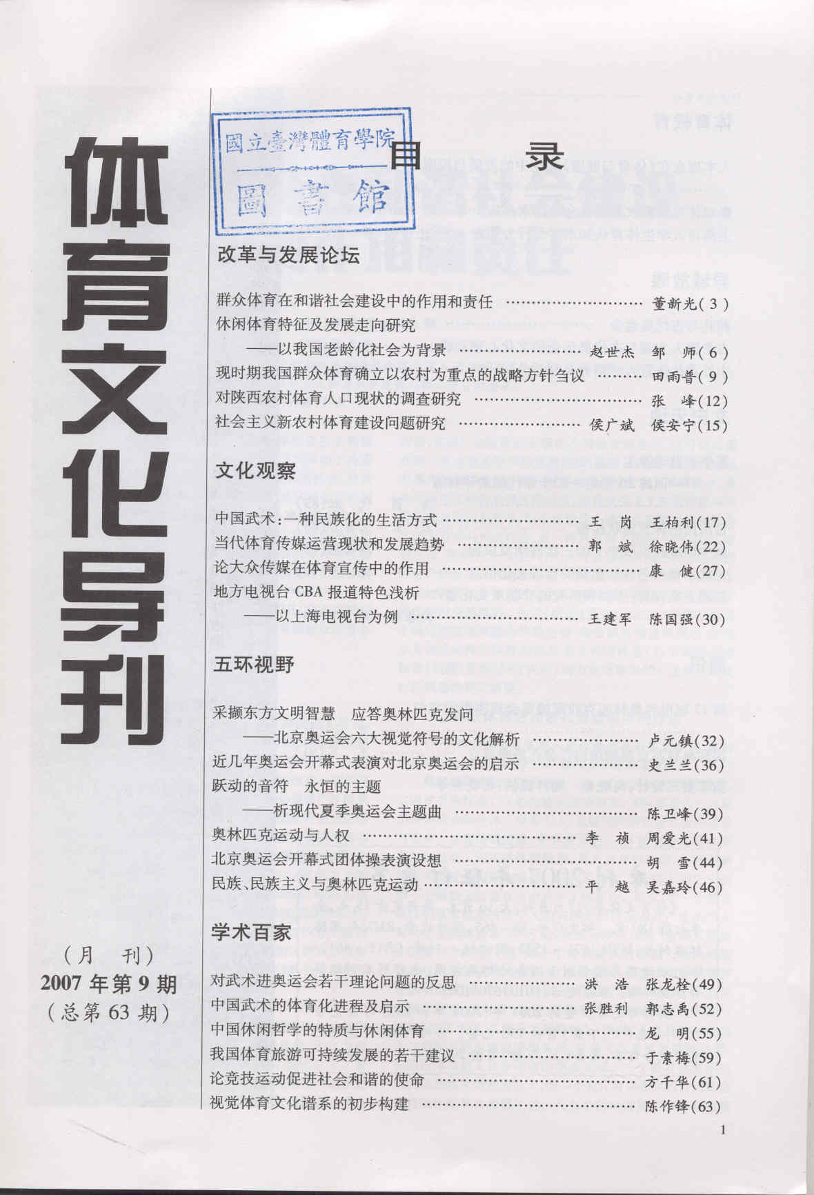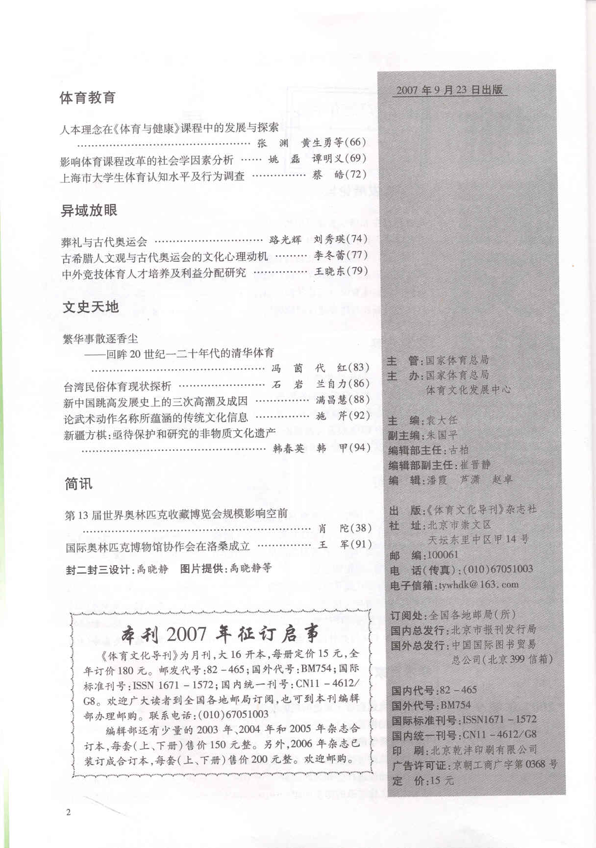 体育文化导刊 2007-09No.63(目次服務)