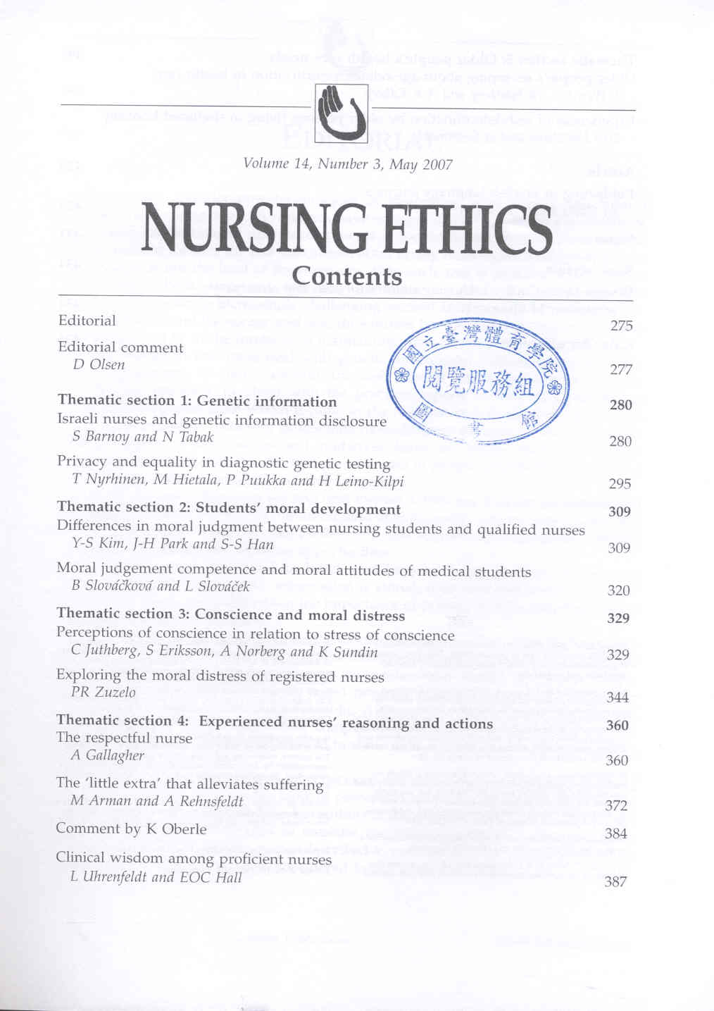 Nursing Ethics 2007-05v.14-3(目次服務)