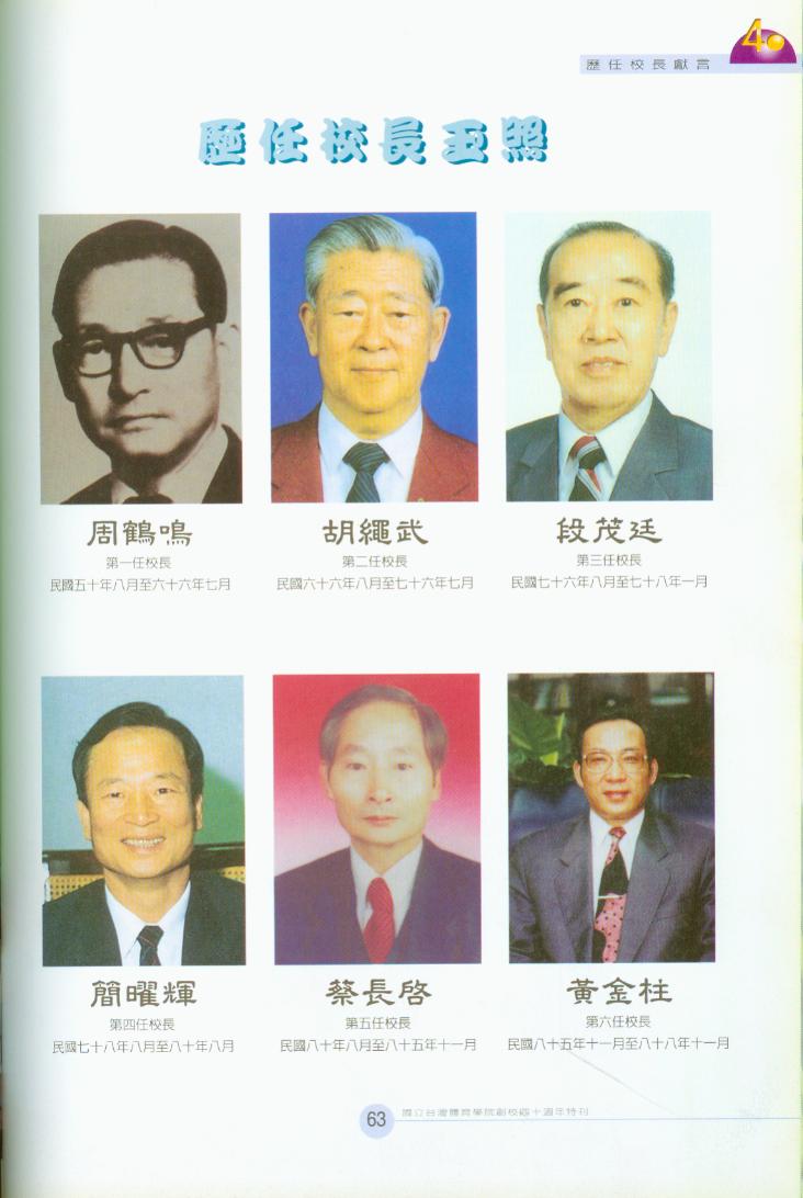 第一任周鶴鳴校長民國50年8月至66年8月 第二任胡繩武校長民國66年9月至76年7月 第三任段茂廷校長民國76年8月至78年1月 第四任簡曜輝校長民國78年2月至80年8月 第五任蔡長啟校長民國80年9月至85年11月 第六任黃金柱校長民國85年11月至88年11月 代理校長蘇金德民國88年11月至89年11月 第七任陳全壽校長民國89年11月至93年5月 代理校長陳相榮民國93年5月至94年1月 第八任蘇文仁校長民國94年2月至99年4月13日 代理校長王玉英民國99年4月14日至99年7月31日 第九任蘇文仁校長民國99年8月1日∼102年7月31日 第十任林華韋校長民國102年8月1日~(現任校長)