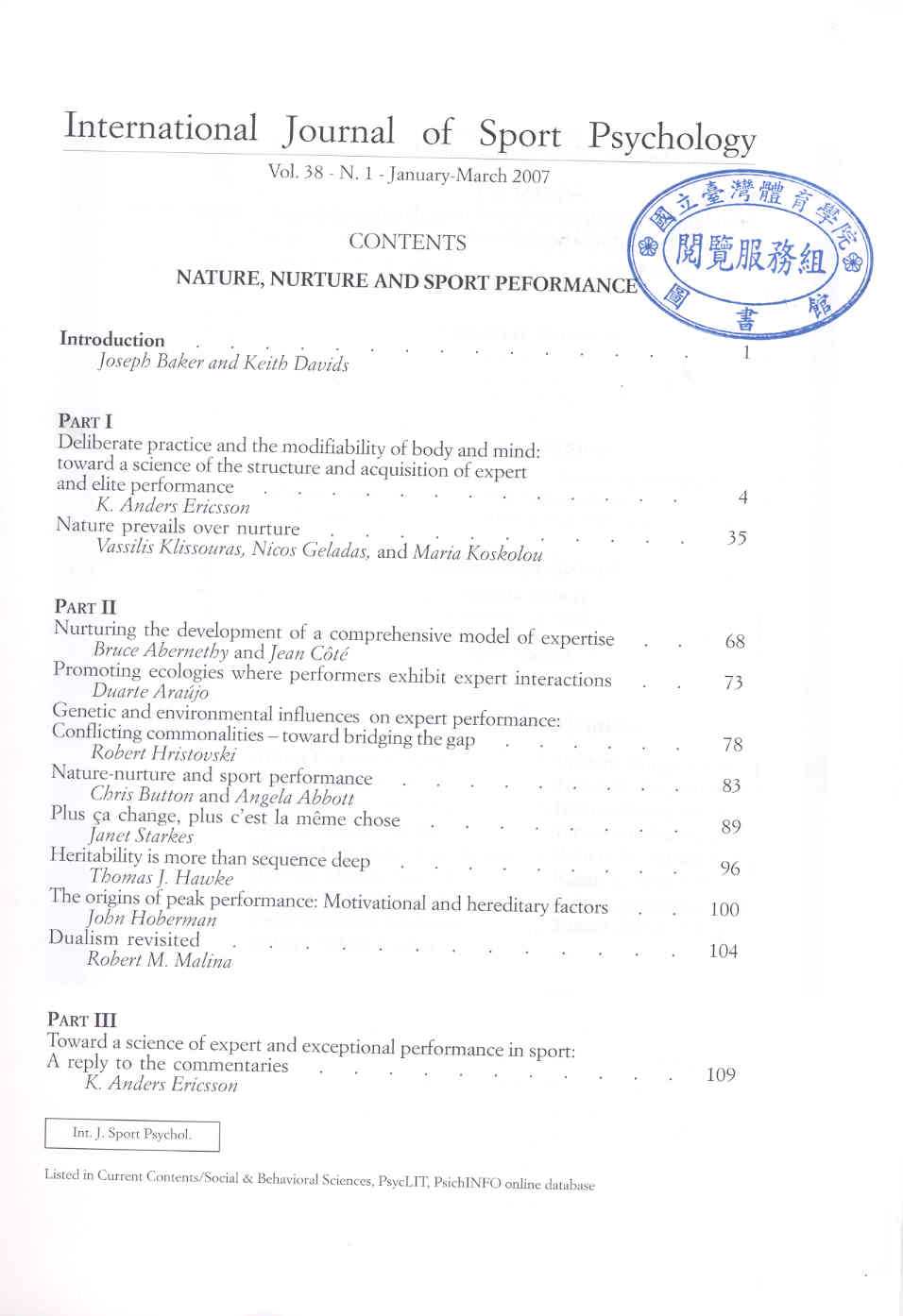 Internatinal Journal of Sport Psychology 2007-01-03v.38-1(目次服務)