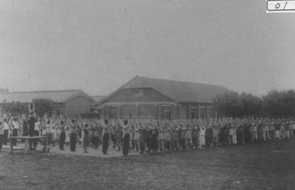 旭日東昇,全體師生在操場上做早操。像這樣的晨間活動,一直延續到八○年代改變成課間操。(圖文:蔡麗美)