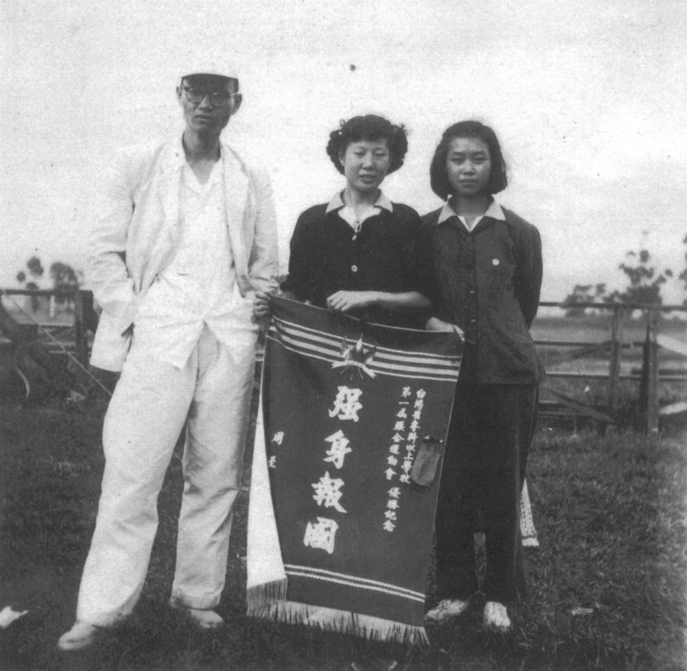 1952年(民41)第一屆台灣省專科以上學校聯合運動會在台灣大學舉行,省立師範學院選手吳君植(中者)獲得60公尺、100公尺及400公尺接力三項冠軍,與教練楊基榮先生合影。 (圖:吳萬福 文:雷寅雄)