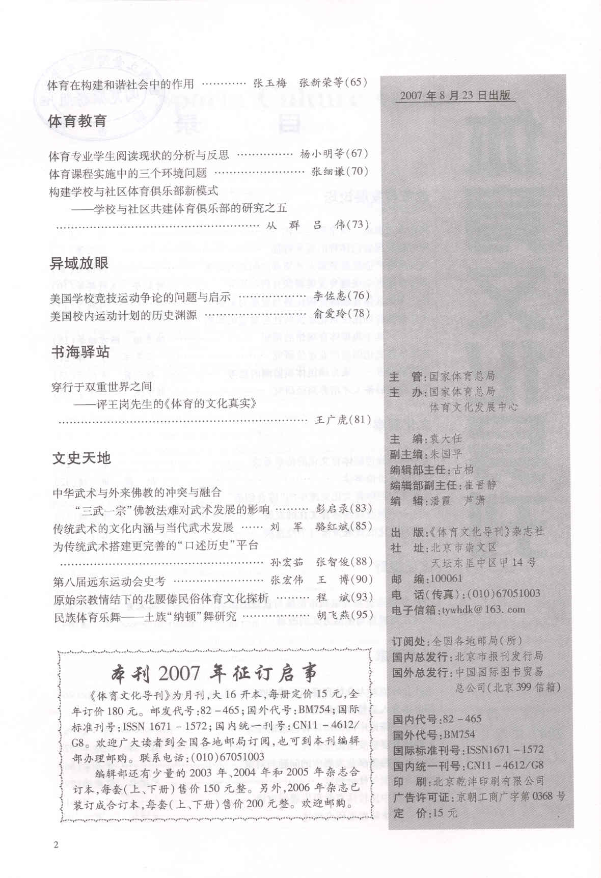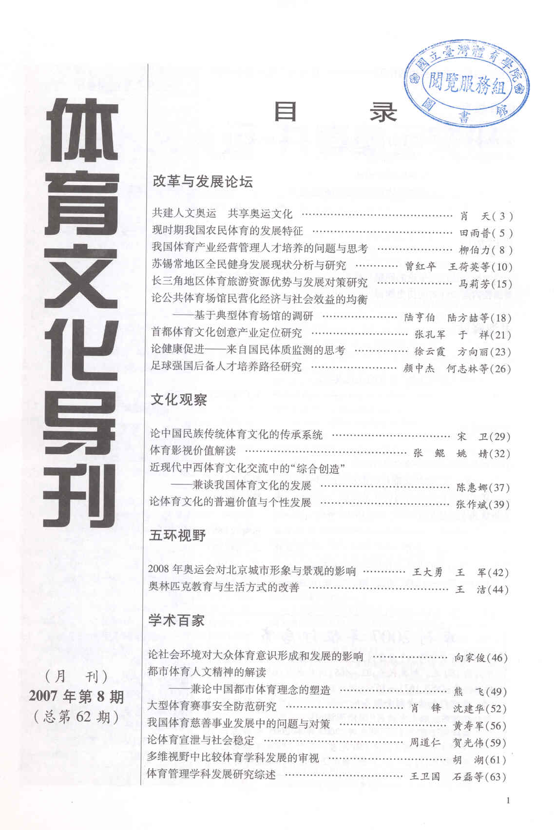体育文化导刊 2007-08No.62(目次服務)