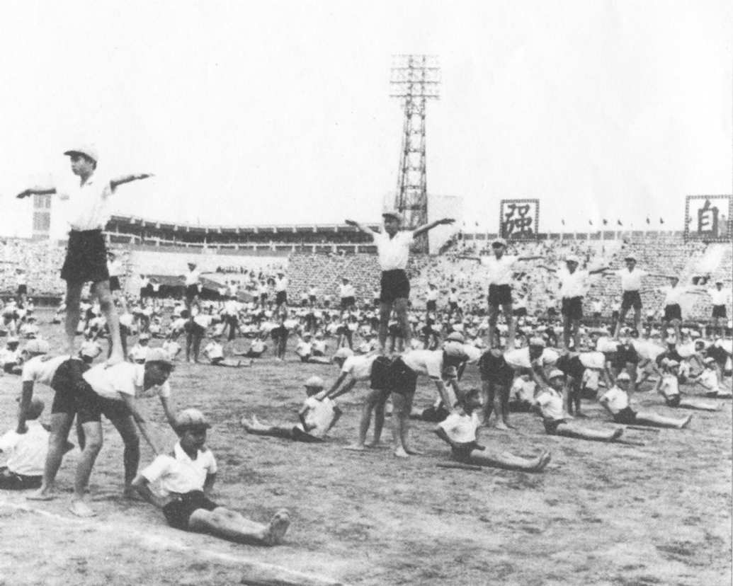 1976年(民65年)台北市第九屆國民小學運動會開幕式中,太平國小六百位學童表演疊羅漢情形。