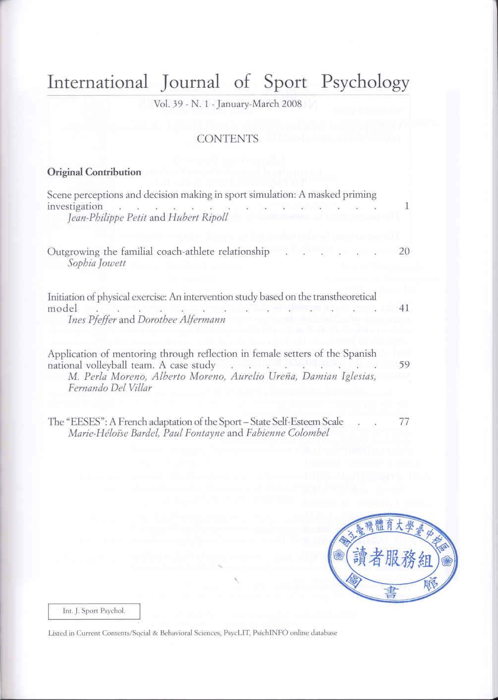 Internatinal Journal of Sport Psychology 2008-01-03v.39-1(目次服務)