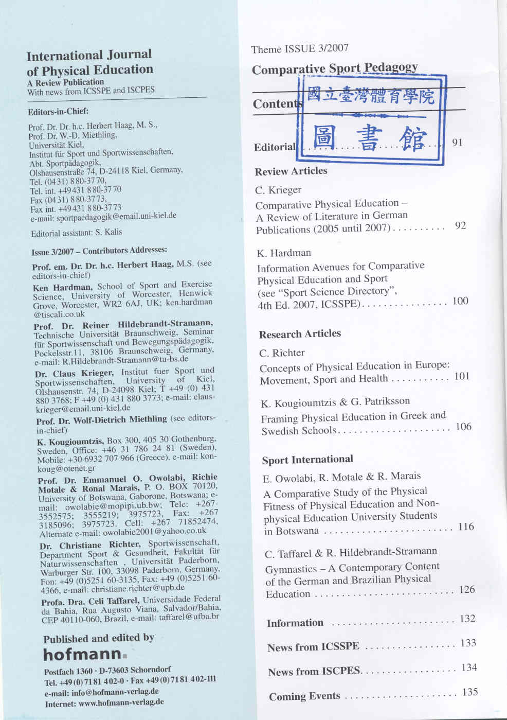 Internatinal Journal of Physical Education 2007-09v.44-3(目次服務)