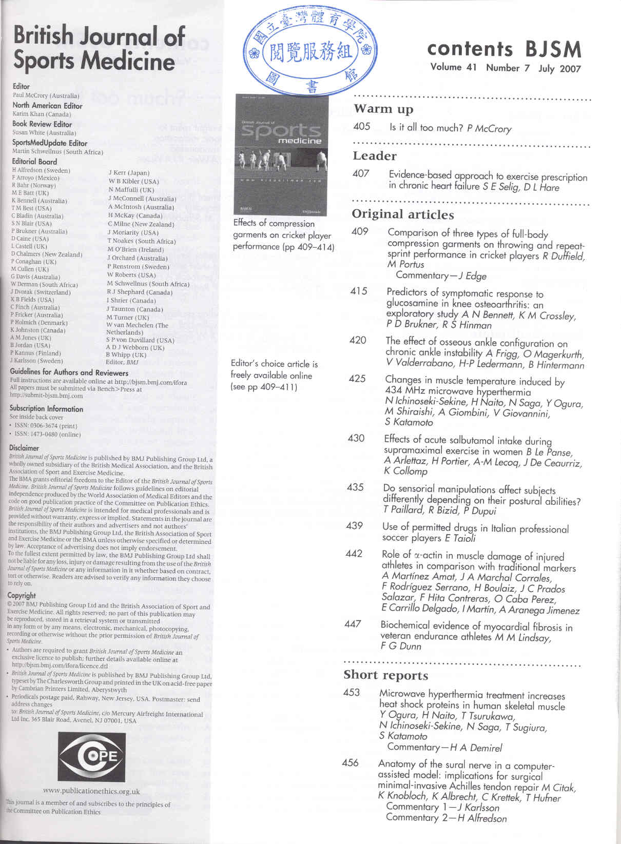 British Journal of Sports Medicine 2007-07v.41-7(目次服務)