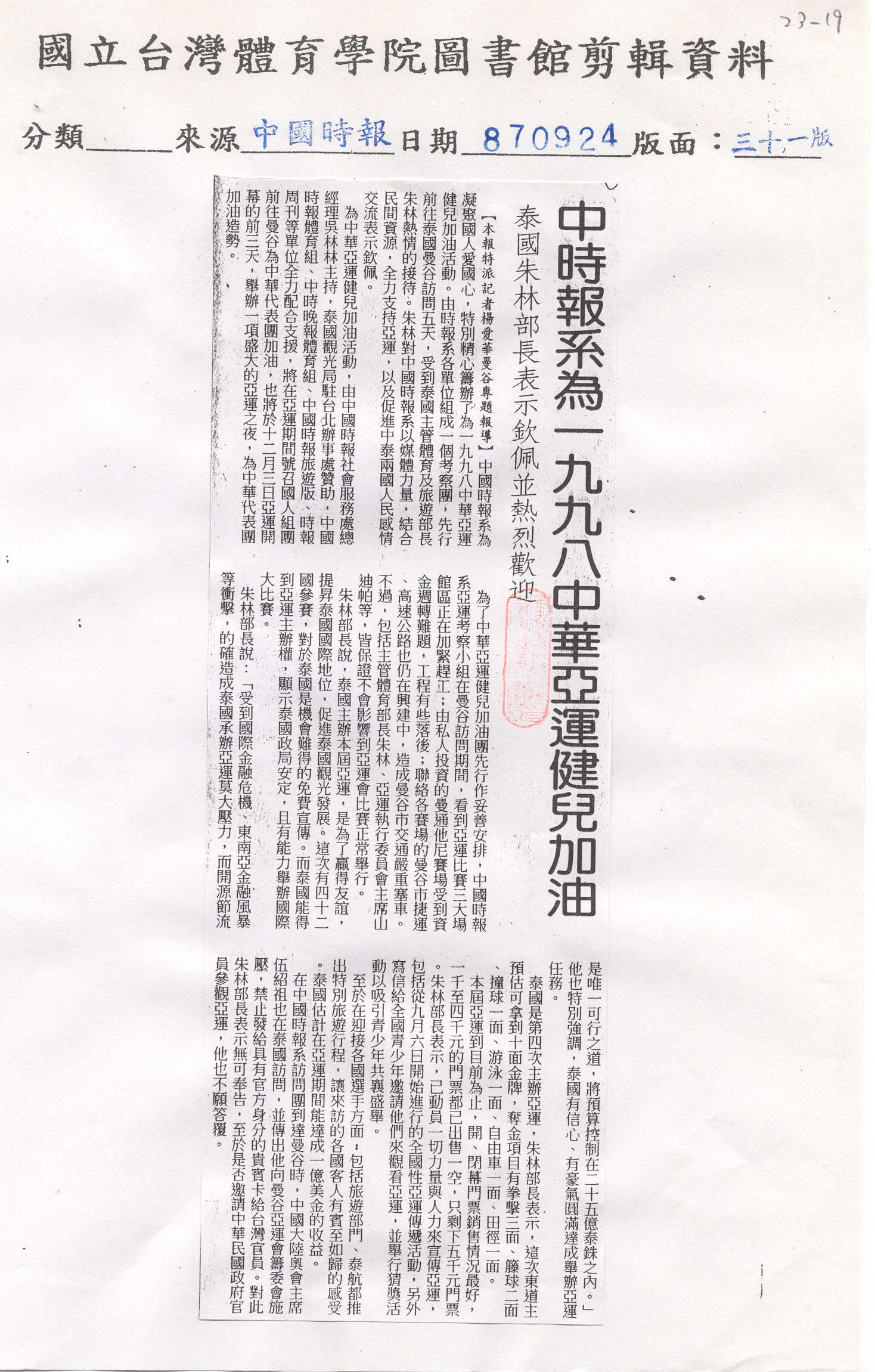 中時報系為一九九八中華亞運健兒加油 泰國朱林部長表示欽佩並熱烈歡迎