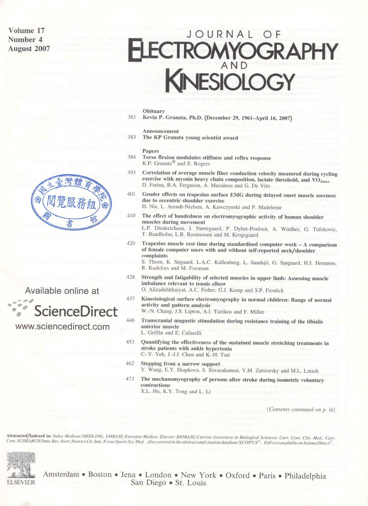 Journal of Electromyography Kinesiology 2007-08v.17-4(目次服務)