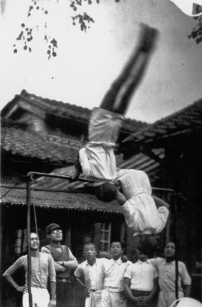 在學校體育中,單槓是很基本的體操運動項目。五、六十年前,一般學生幾乎都會輕輕鬆鬆玩幾下,圖攝於1940年,竹東公學校高等科男生正在做前迴環與反握曲臂大迴環。 (圖:李煥坤 文:張素珠)