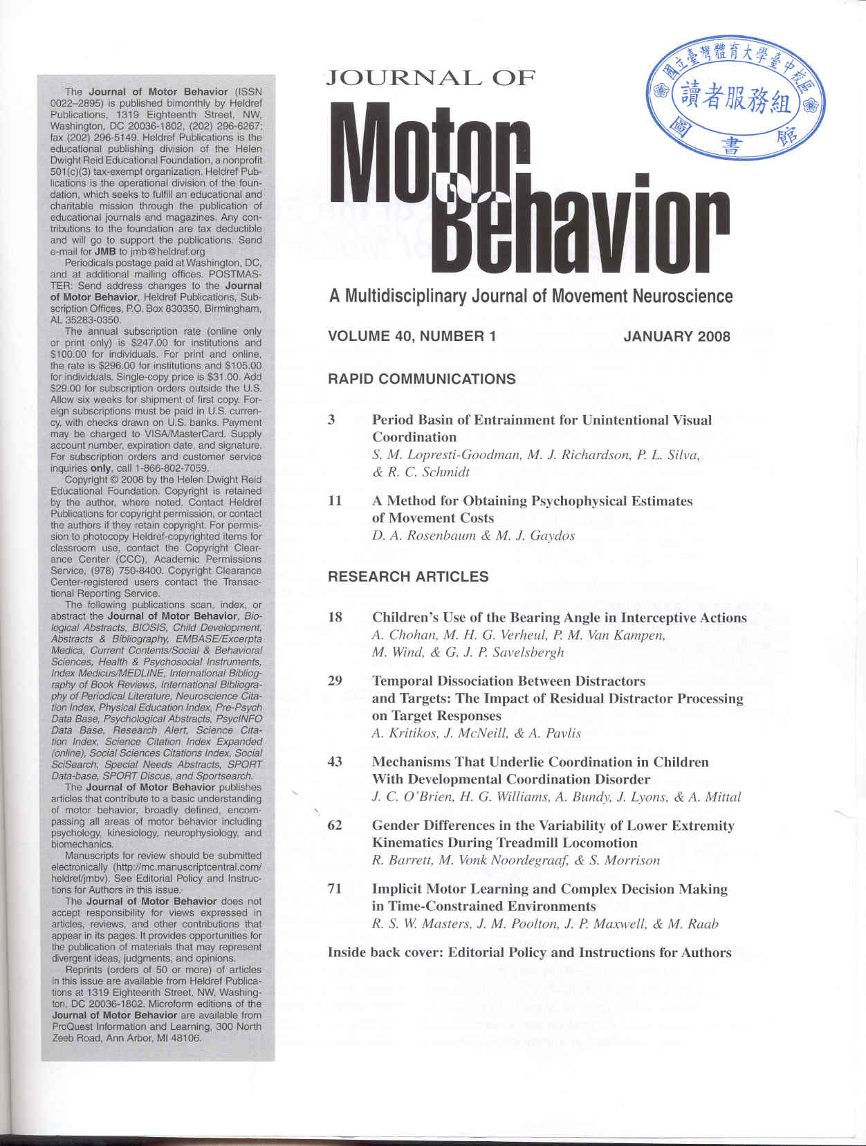Journal of Motor Behavior 2008-01v.40-1(目次服務)