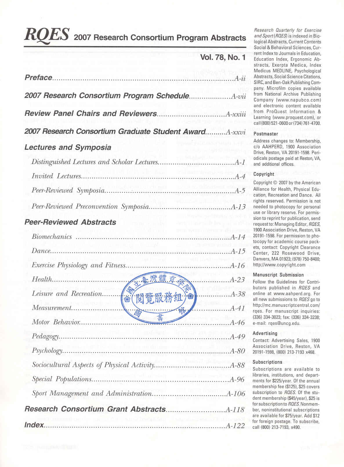 Research Quarterly for Exercise and Sport 2007-03v.78-1(目次服務)