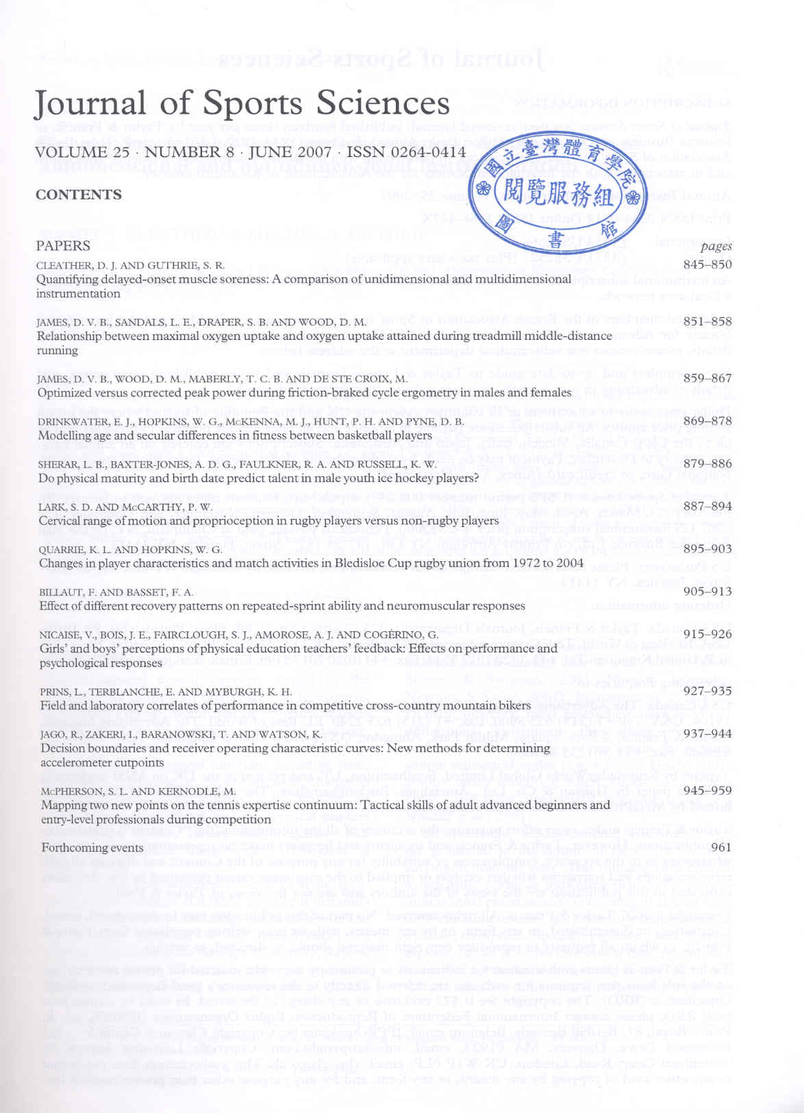 Journal of Sports Science 2007-06v.25-8(目次服務)