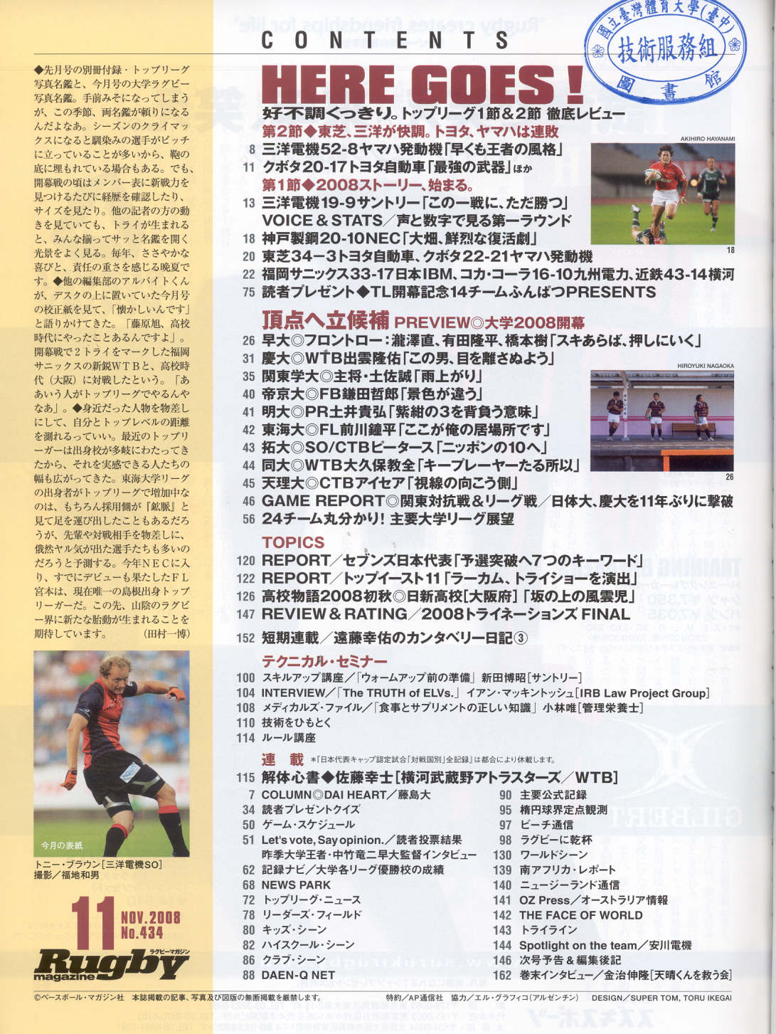 ラクビ—マガジン 2008-11No.434(目次服務)
