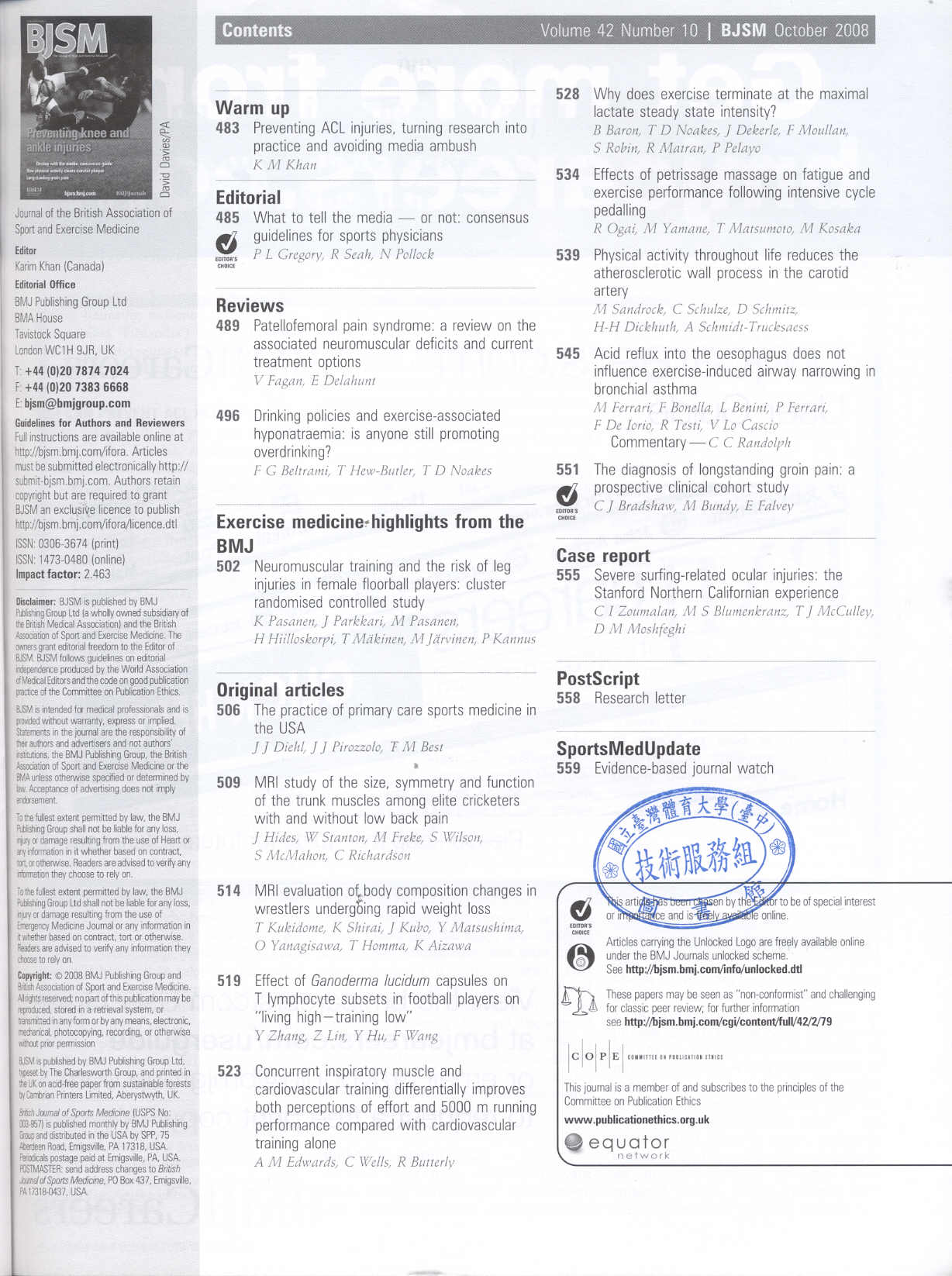 British Journal of Sports Medicine 2008-10v.42-10(目次服務)
