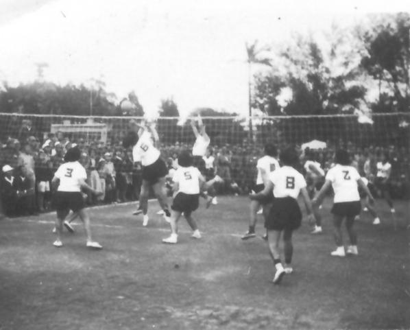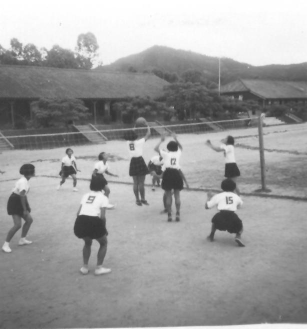 戰後初期,臺灣教育經費捉襟見肘。民國41年,芎林初中全校體育器材中只編列一個排球。李煥坤老師找來18位女生,利用課後經常一起「玩」排球,當年打九人制,報名參加民國42年全省中等學校排球錦標賽,沒料到竟抱回冠軍獎盃,此後蟬聯四屆冠軍。此照片攝於民國42年芎林初中校園,得冠軍後開始「練」球的情形。 (圖:李煥坤 文:張素珠)