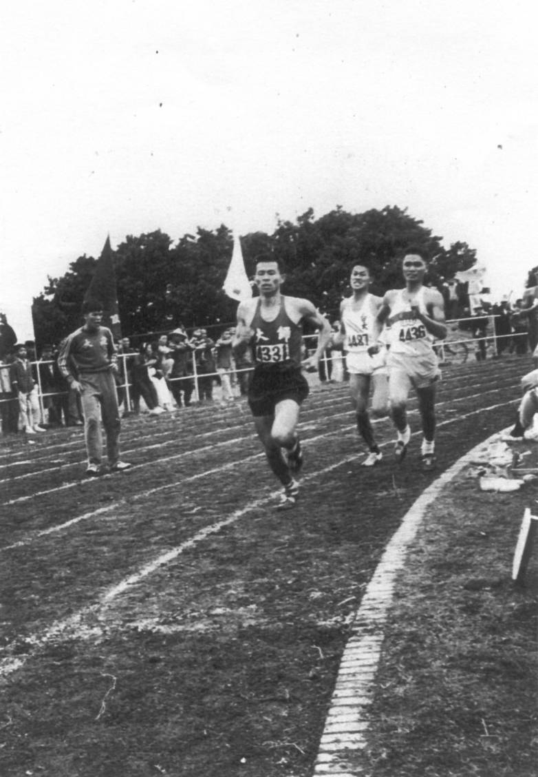 1966年(民55年)台灣省中等以上學校運動會在新竹縣運動場舉行,大專組800公尺決賽時情形,當時為泥土場地較鬆軟,場地邊沿是用紅磚橫排做成,與規則五公分邊沿有出入。 (圖文:雷寅雄)